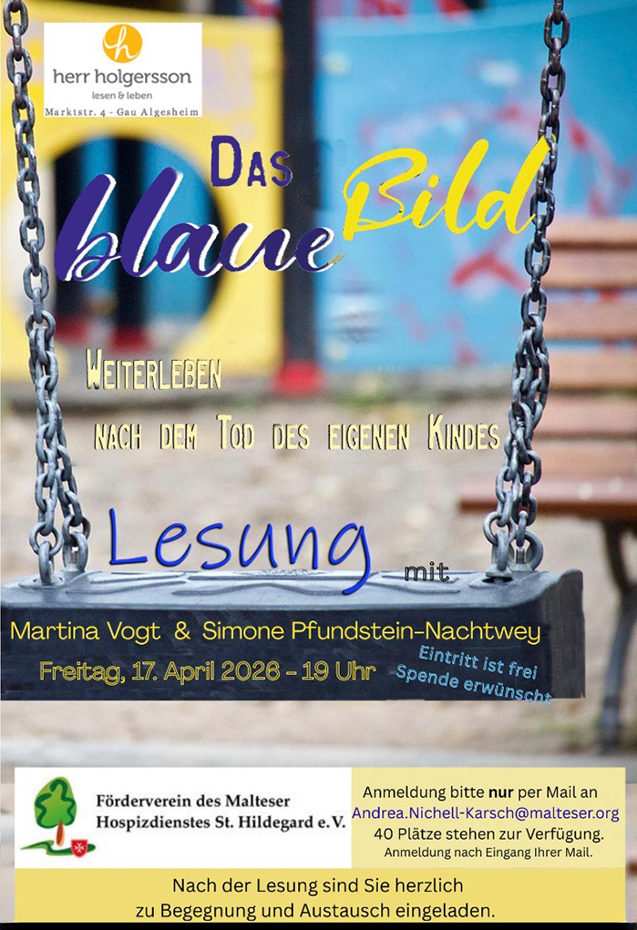 Der Förderverein des Malteser Hospizdienstes e.V. lädt am Freitag, den 17. April 2026 um 19 Uhr zu einer besonderen Lesung in die Buchhandlung Holgersson in Gau Algesheim, Am Marktplatz 4, ein.